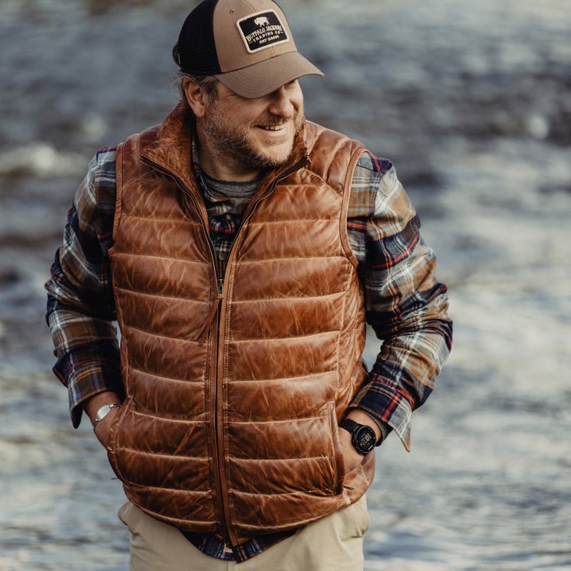 Want to read more about the benefits of soft leather like lambskin? Lambskin is an exceptionally wearable and soft leather. Its natural, lightweight layers give it a distinctive, velvety texture. Even though lambskin leather is thin and lightweight, it still does a good job of keeping out the cold, making it an ideal material for a leather down vest. Because of its delicate structure, lambskin is treated less harshly in production than cowhide and requires more hand manipulation. This often results in lambskin being more expensive than cowhide, which is why it’s generally reserved for premium leather products like our Bridger Leather Down Vest.