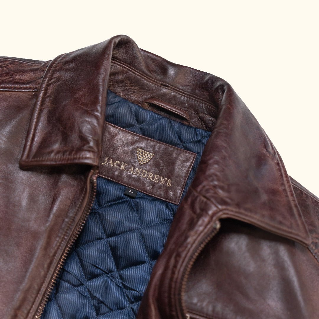 Inside, the Glenwood is just as impressive, featuring a luxurious quilted navy lining that adds warmth and a touch of sophistication. An interior pocket provides practical storage for your essentials, making this mahogany leather driving jacket as functional as it is striking—ready to accompany you on any adventure.