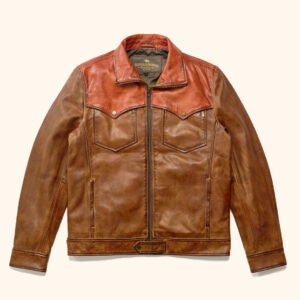 Crafted from rich sheepskin leather in a warm brown tone, with a striking copper-burnt orange yoke across the shoulders. Its western silhouette pays homage to cowboy tradition, while sharp detailing gives it a contemporary edge.