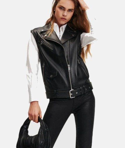 • Collar: Wide lapel biker collar